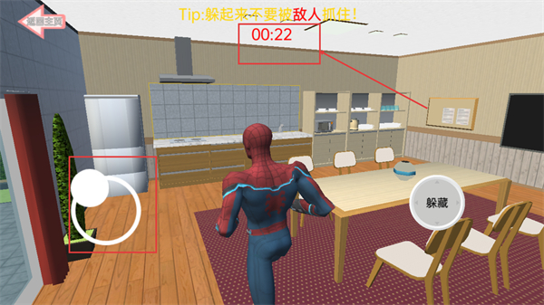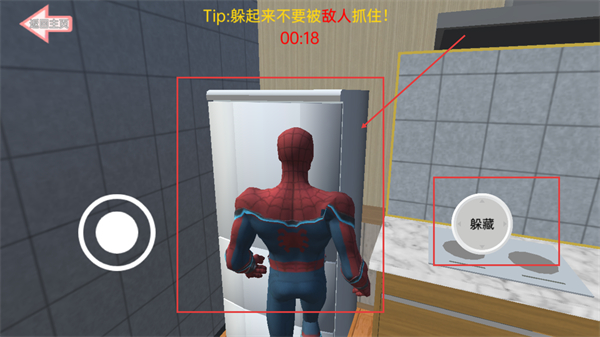 3、操控角色移动至可隐藏的区域(如冰箱旁),点击右侧【躲藏】按钮,完成角色的隐藏操作。
