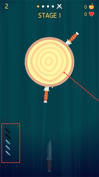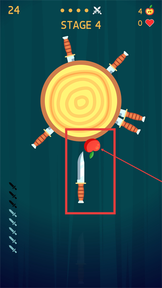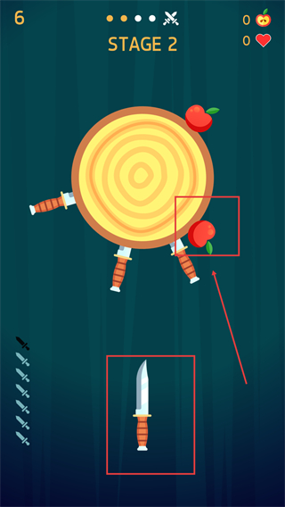 3、后续关卡中,木轮会出现苹果等道具,瞄准道具投掷刀具,命中后可获得额外奖励。