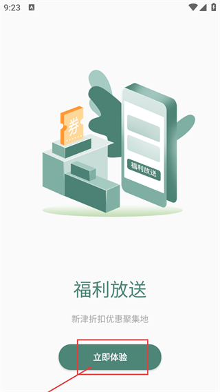 1、看到【福利放送】入口后点击【立即体验】,可进入新津折扣优惠聚集地,获取相关福利权益及优惠资源。