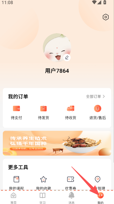 1、设我的订单板块,含待支付等订单状态分类,配备更多工具,适配养生服务的订单与学习管理需求。