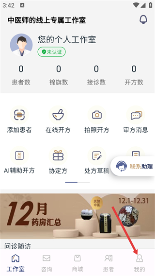 1、在【中医师的线上专属工作室】页面,可查看【患者数】等数据,点击底部【我的】选项,进入个人功能管理界面。