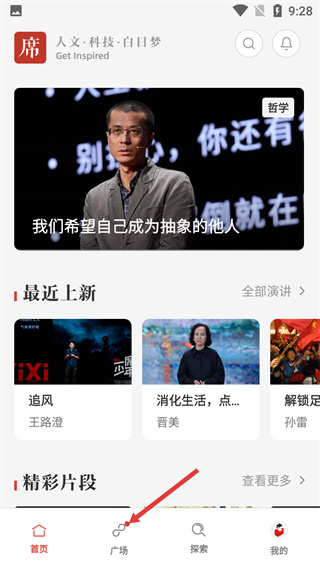 1、进入“一席”首页,点击底部的“广场”选项,进入广场页面,可查看其他用户分享的演讲相关内容。