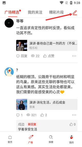 2、在广场页面,点击右上角的编辑按钮,进入动态发布的编辑界面,准备创作并发布内容。