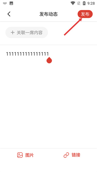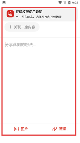 3、在动态编辑界面,可选择关联“一席”内容,在输入框填写想法,还能添加图片或链接丰富内容。
