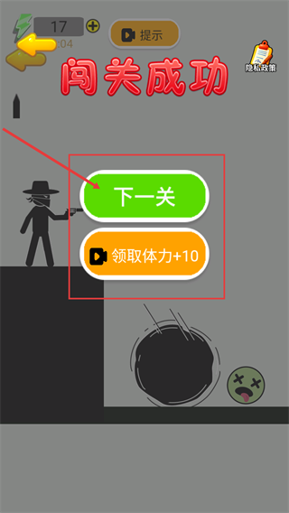 4、达成【闯关成功】后,可点击【下一关】继续挑战,或选择【领取体力+10】补充资源,助力后续关卡的推进。