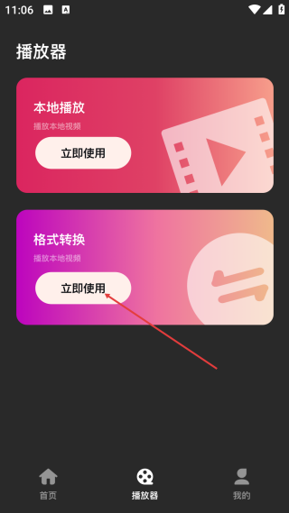 2、在播放器页,点击格式转换的【立即使用】,进入对应操作页。