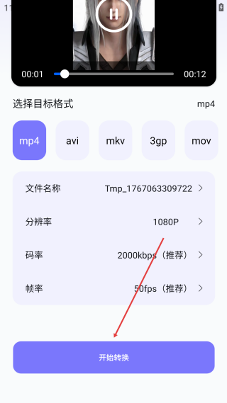 4、在格式转换页,选好参数后点击【开始转换】,即可完成视频格式转换。
