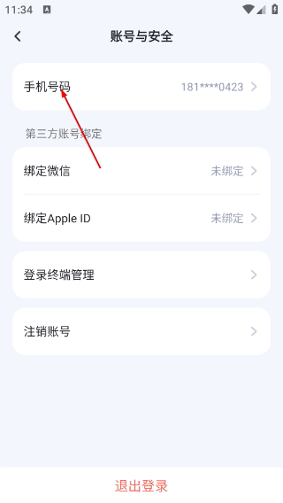 3、在“账号与安全”页面,点击“手机号码”选项,进入当前绑定手机号码的详情页面。