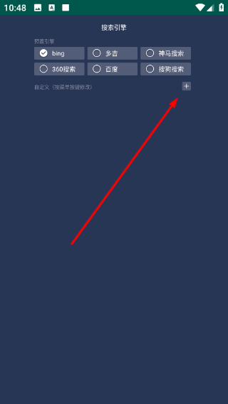 2、在搜索引擎页面点击右上角【+】按钮,弹出“自定义搜索引擎”的输入窗口,准备添加新搜索引擎。