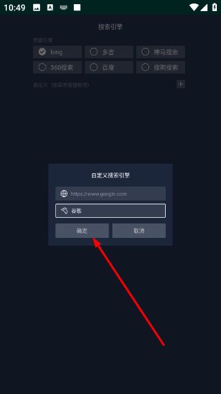 4、确认网址与名称填写无误后,点击【确定】按钮,即可将该搜索引擎添加至可选列表中。