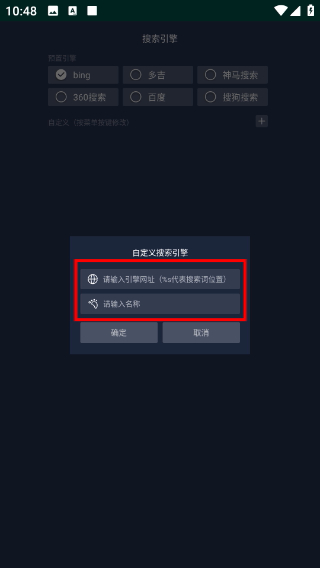 3、在自定义窗口中,依次填写搜索引擎的网址(如【https://www.google.com】)和名称,完成信息录入。