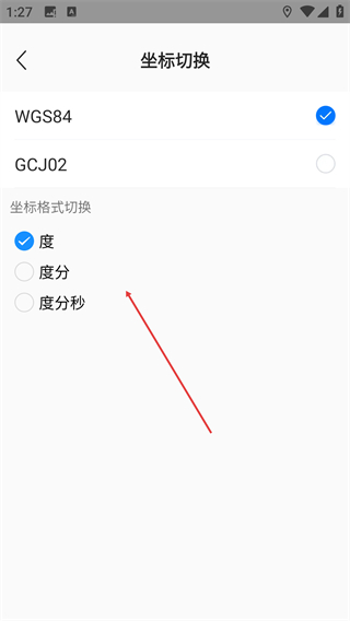 4、在【坐标切换】页,可选择【WGS84】坐标系统,还能切换坐标格式为【度】。
