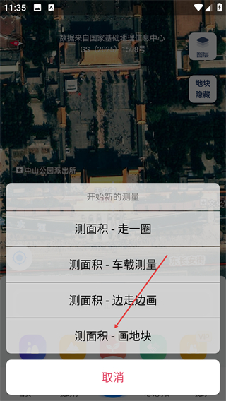 2、在弹出的菜单中选择【测面积-画地块】选项,可进入地块绘制的测量界面。