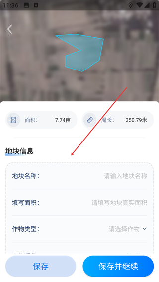 4、完成地块绘制后,可查看计算出的【面积】【周长】,并填写地块相关信息后保存。
