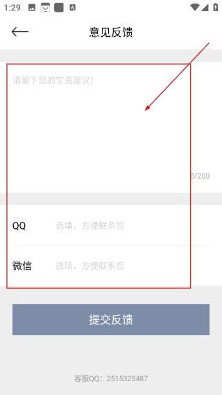 3、在意见反馈页面输入框【填写建议】,选填【QQ、微信】联系方式。