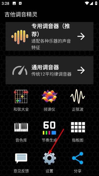 1、进入【吉他调音精灵】主界面,找到底部【设置】按钮并点击,主界面还提供专用调音器-通用调音器等功能模块。