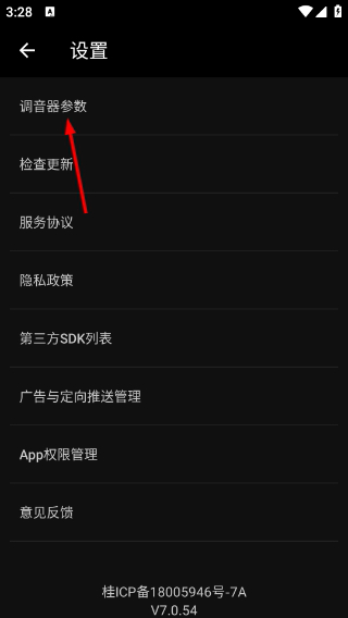 2、进入设置页面后,选择【调音器参数】选项,这是进入调音相关参数配置的入口,点击即可跳转至参数设置页。
