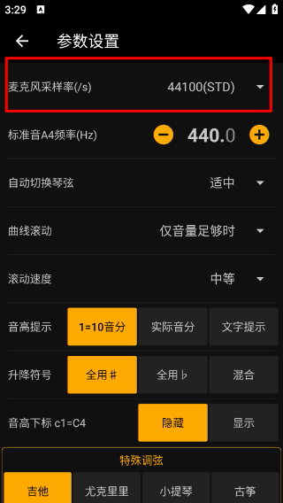 3、进入参数设置页面,找到【麦克风采样率/(s)】设置项,当前默认值为44100(STD),可在此调整该参数。