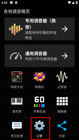 2、进入主界面后,找到底部的【设置】按钮并点击,主界面还提供专用调音器-通用调音器等功能模块。