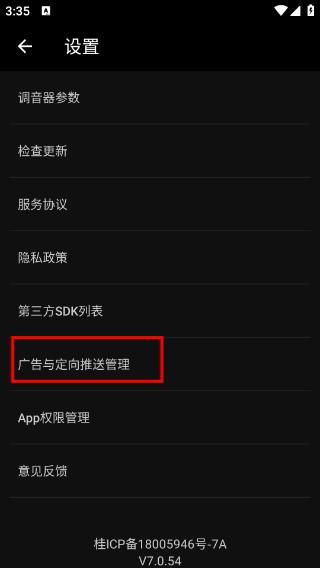 3、进入设置页面,选择【广告与定向推送管理】选项,点击该选项即可进入对应的广告设置界面。