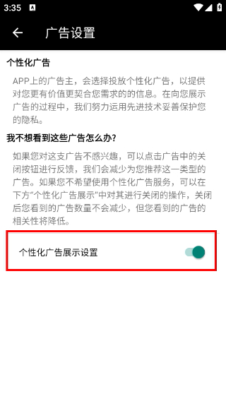 4、进入广告设置页面,找到【个性化广告展示设置】的开关,可通过开启或关闭该开关调整个性化广告的展示状态。