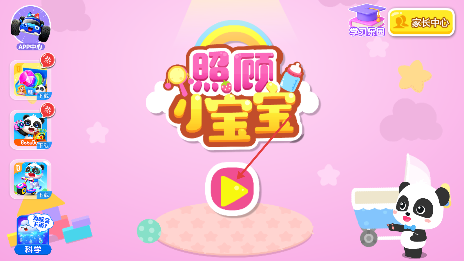 2、在游戏场景中,关注婴儿车中的熊猫宝宝,准备进行照顾操作。