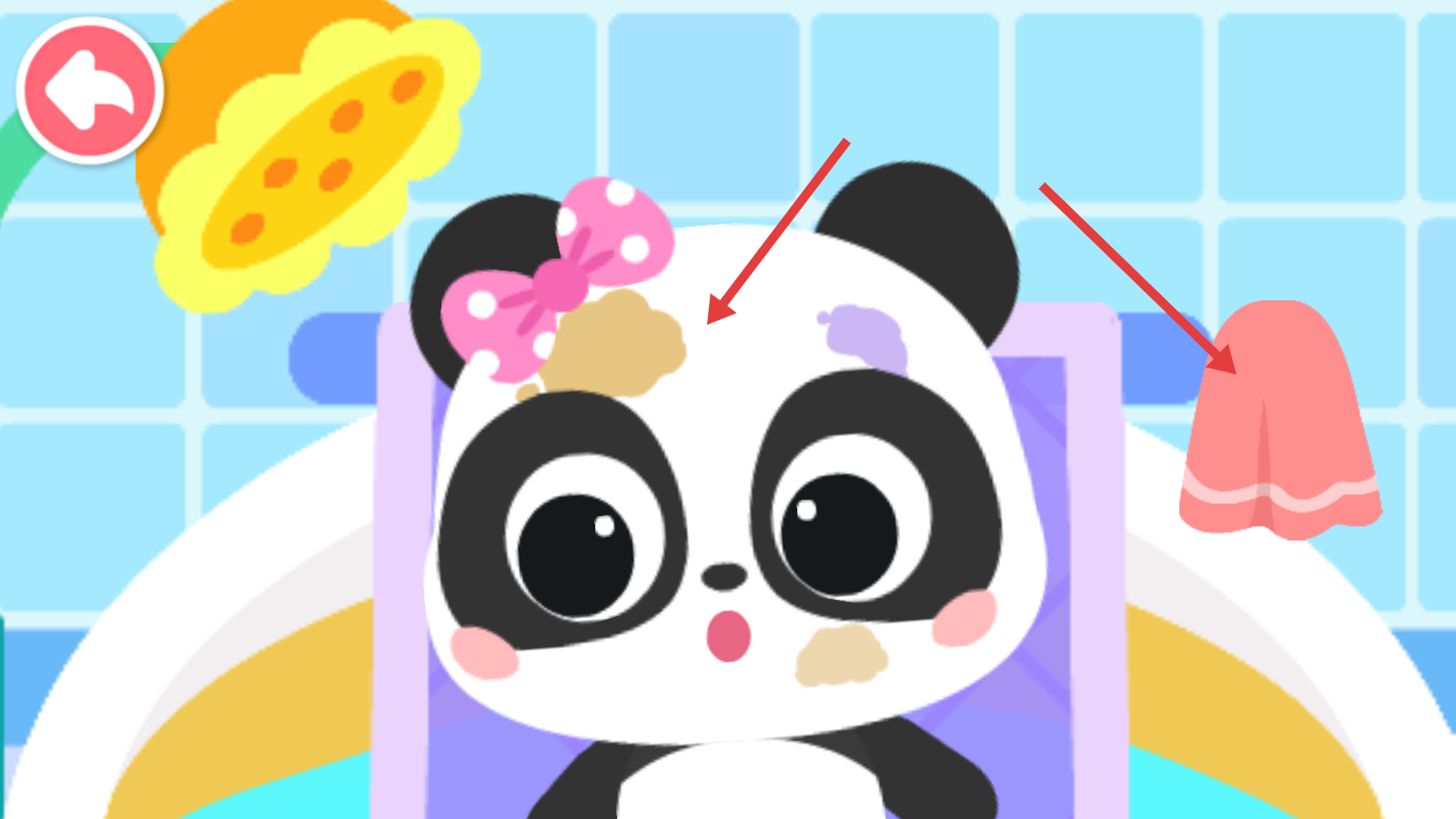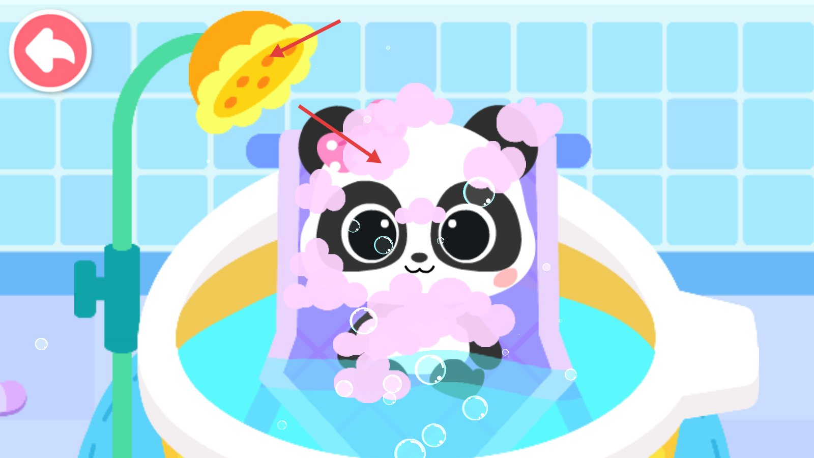 4、给熊猫宝宝洗澡,用淋浴设施和泡泡,将其清洗干净。