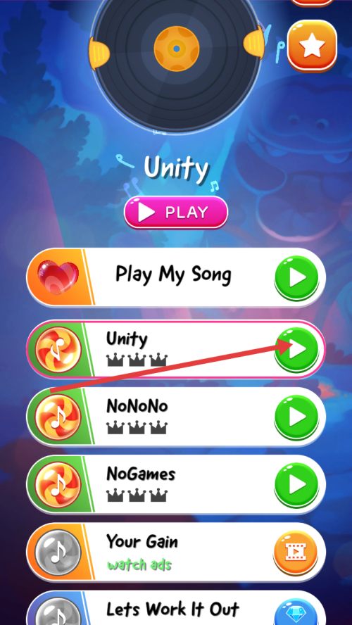 1、进入游戏,选择【Unity】歌曲,点击右侧绿色播放按钮,开启该歌曲的游戏挑战。