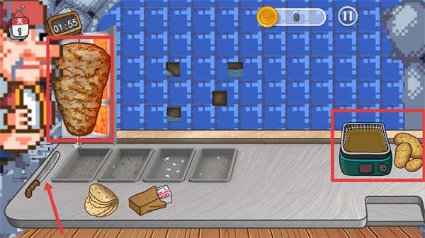 2、在厨房场景中,利用刀具处理红色框内的烤肉,同时关注红色框内的炸锅及土豆,准备制作餐品。