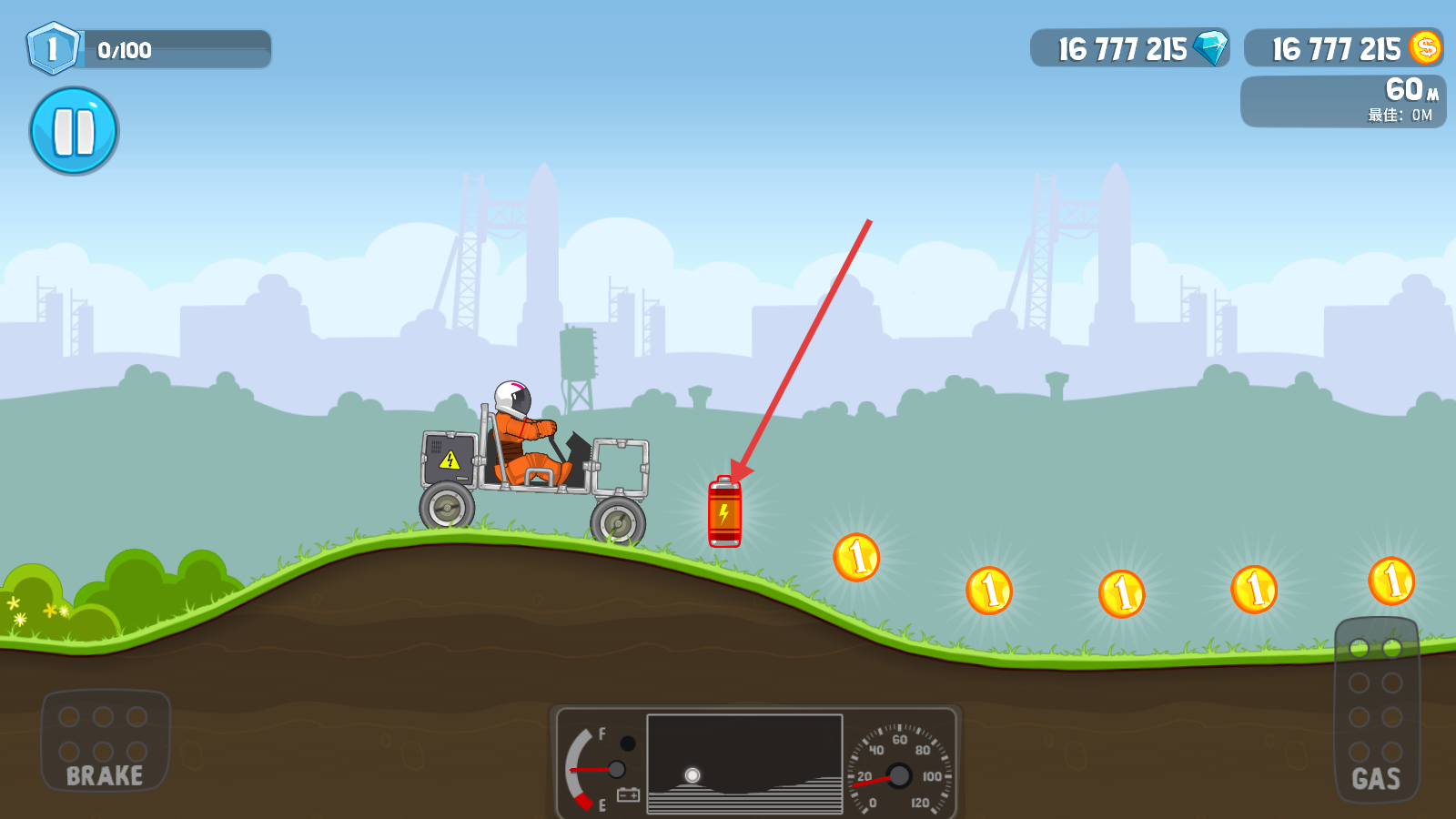 3、遇到红色电池道具,尽量获取,它能助力车辆行驶。