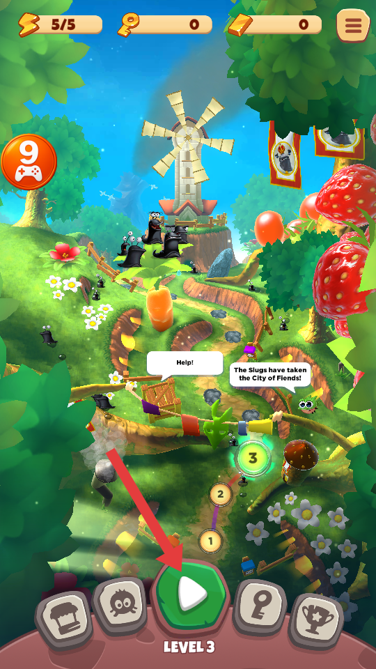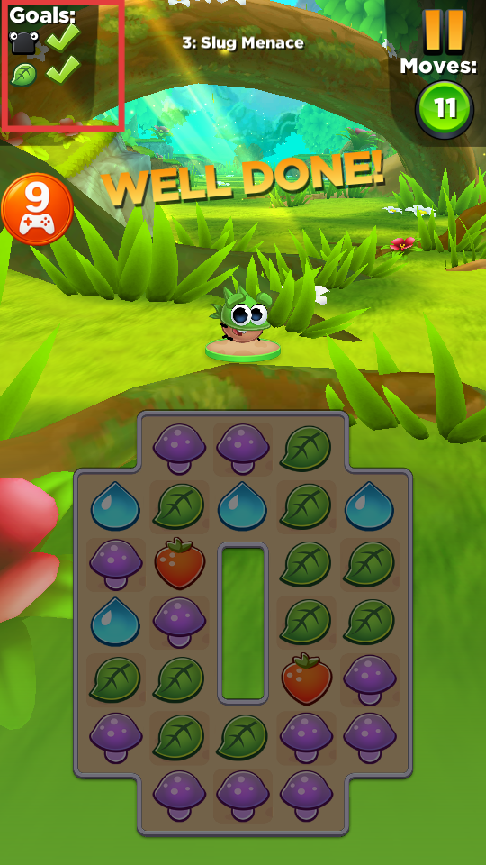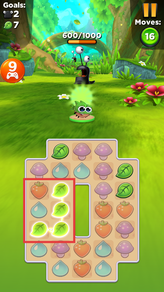 3、通过【滑动】屏幕,使【三个及以上相同】图案连成一线,触发消除,消除图案可对鼻涕虫造成伤害并收集树叶。