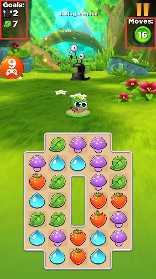 2、进入关卡后,留意左上角的目标任务,如【消灭鼻涕虫】和【收集树叶】的数量要求,以及右上角的【移动步数】限制。