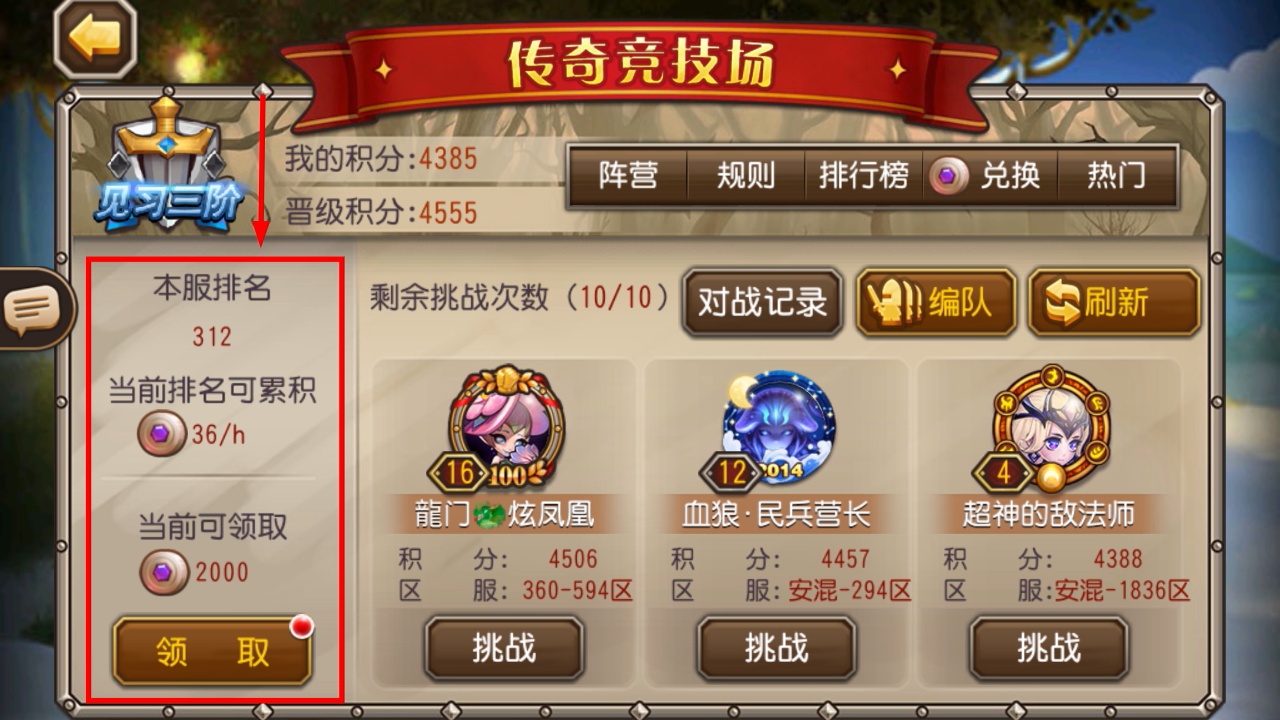 1、在【传奇竞技场】界面先领取可领的【2000】积分,利用剩余挑战次数对战,提升本服排名以积累更多积分。
