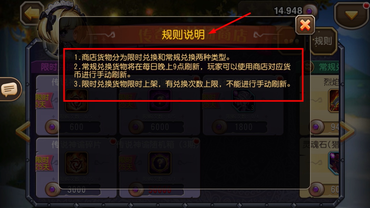 2、【传奇竞技场商店】货物分限时与常规兑换,常规每日晚9点刷新可手动刷,限时有次数上限不可刷。