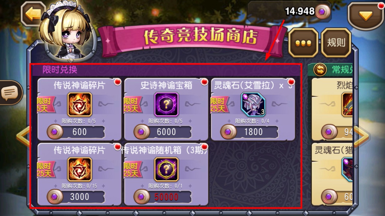 3、【传奇竞技场商店】限时兑换区有【传说神谕碎片】等道具,优先兑换这些限时稀有物品提升实力。