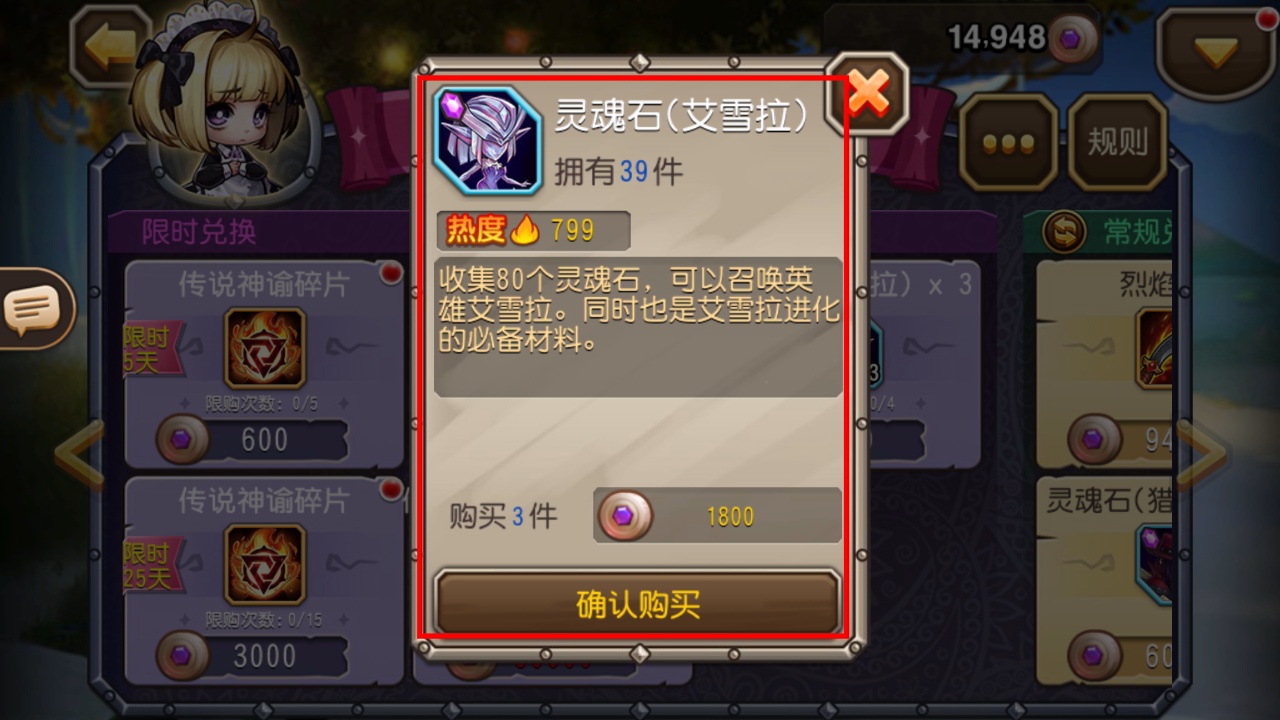 4、如【灵魂石(艾雪拉)】需收集80个召唤英雄,也是英雄进化必备材料,可消耗积分兑换积累。