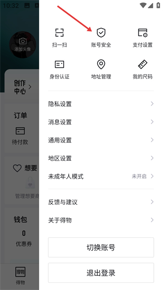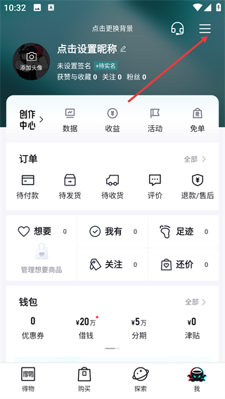 1、打开得物APP,点击底部【我】进入个人页面,再点击右上角三条横线图标,打开侧边栏。