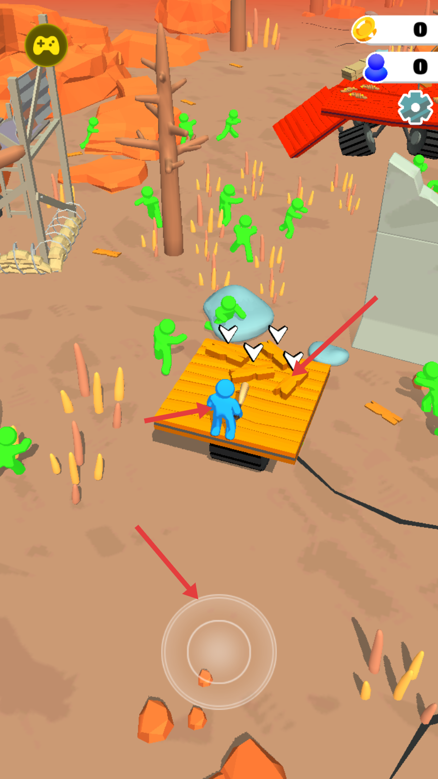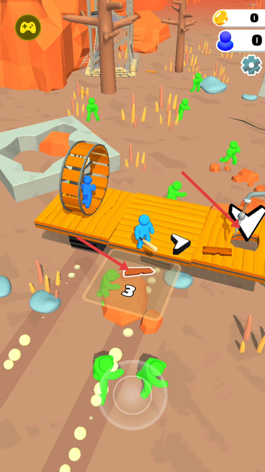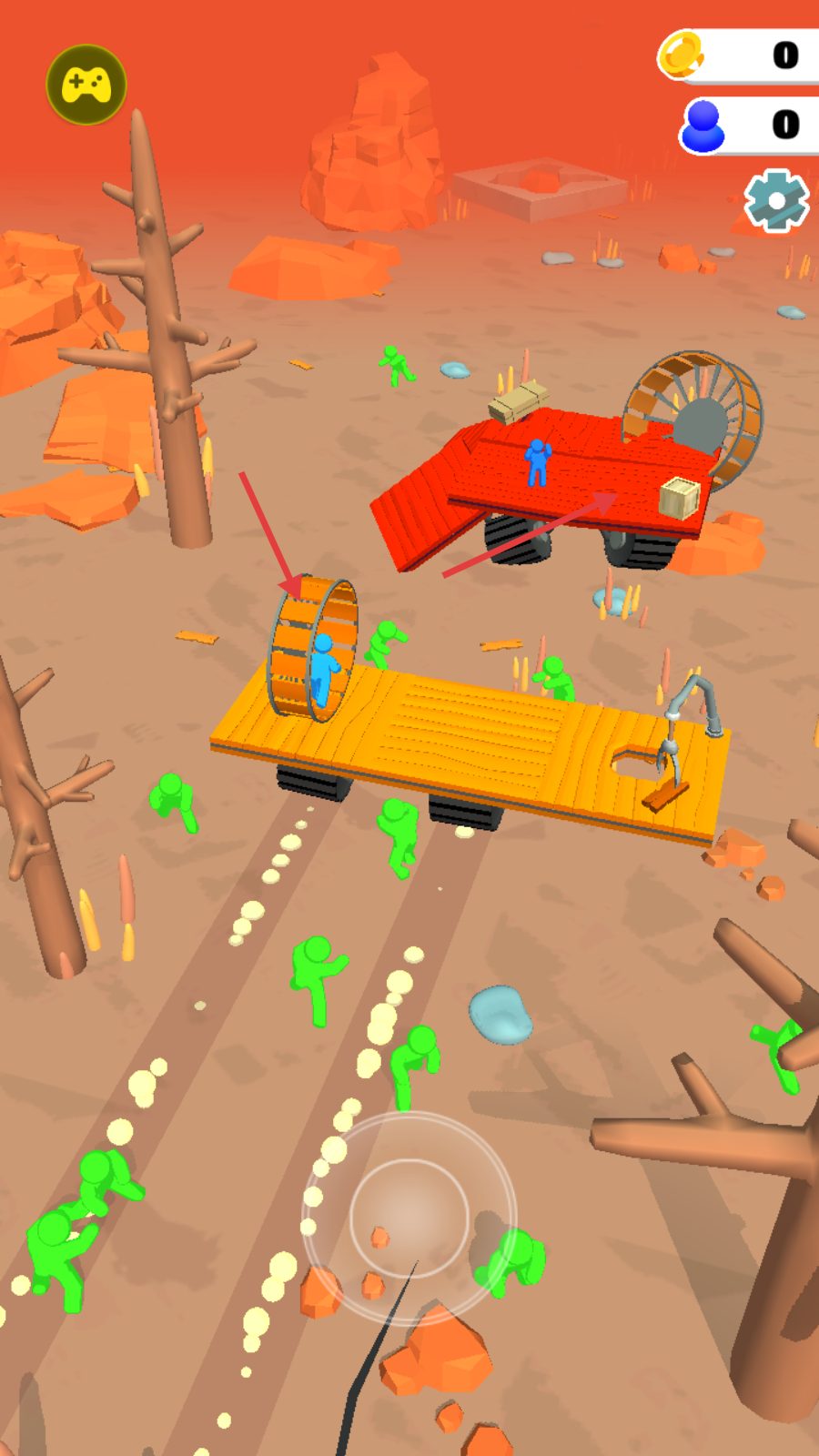 2、让蓝色角色进入滚轮装置,推动平台移动至红色建筑。