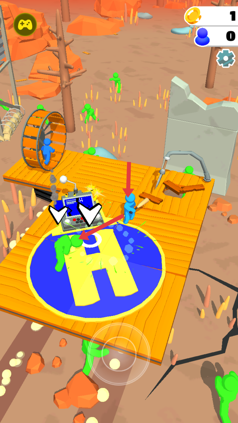 1、控制蓝色角色移动,使用武器攻击绿色敌人。