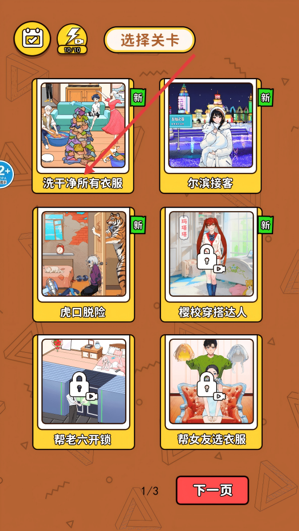 2、在关卡选择界面,选择【洗干净所有衣服】关卡进入。