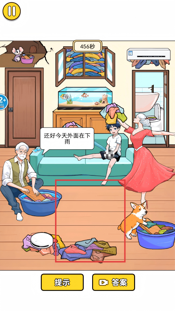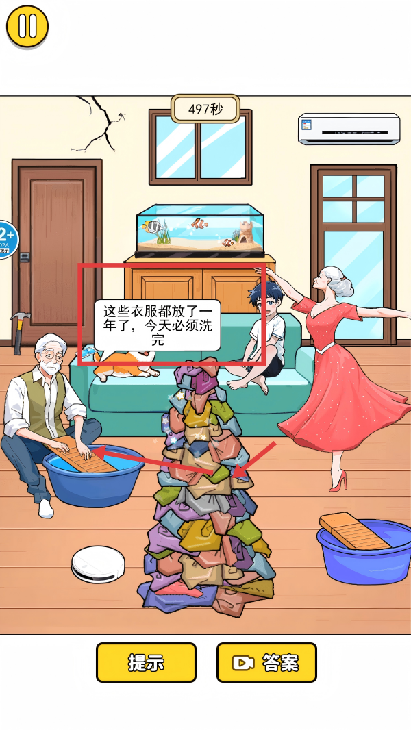 4、可以明显看到衣服已经减少了许多,如果遇到困难,可使用【提示】或【答案】功能辅助完成洗衣任务。