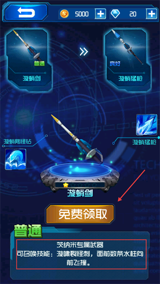 2、在武器界面免费领取【旋蛸剑】,其技能【旋啸裂怪刺】可召唤水柱攻击助力跑酷战斗。