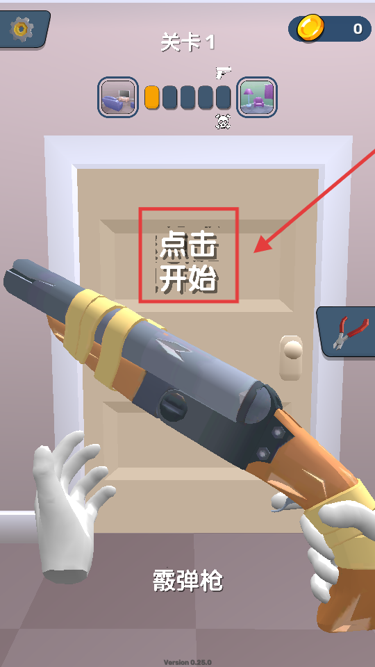 1、点击【点击开始】进入【关卡1】,手持【霰弹枪】准备迎战僵尸。