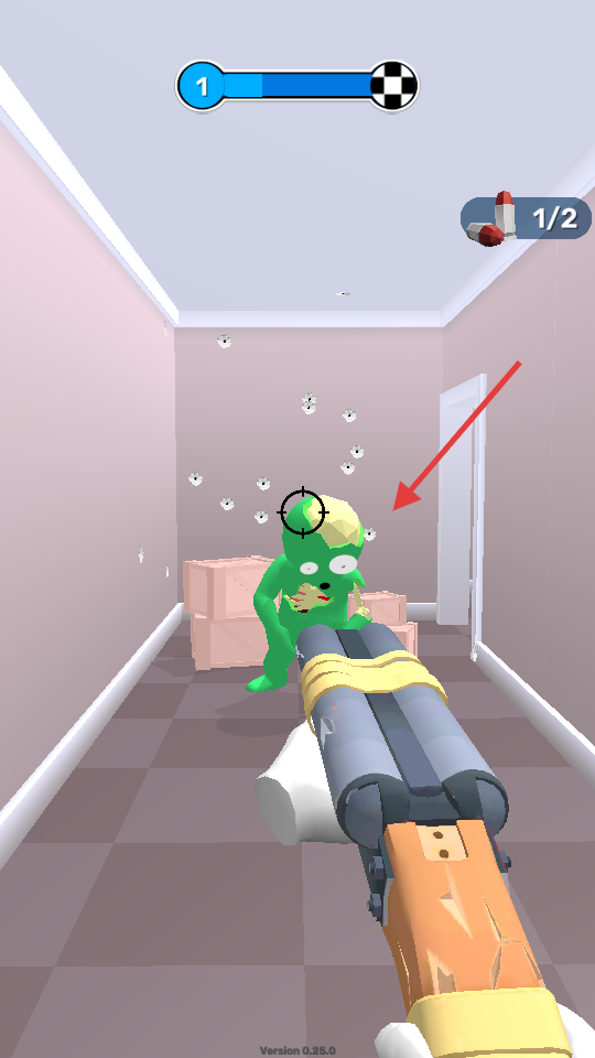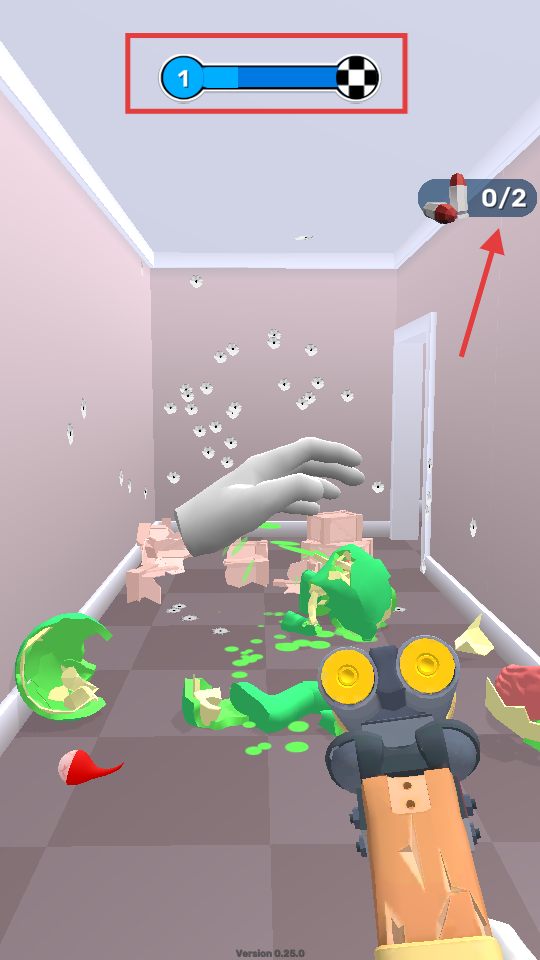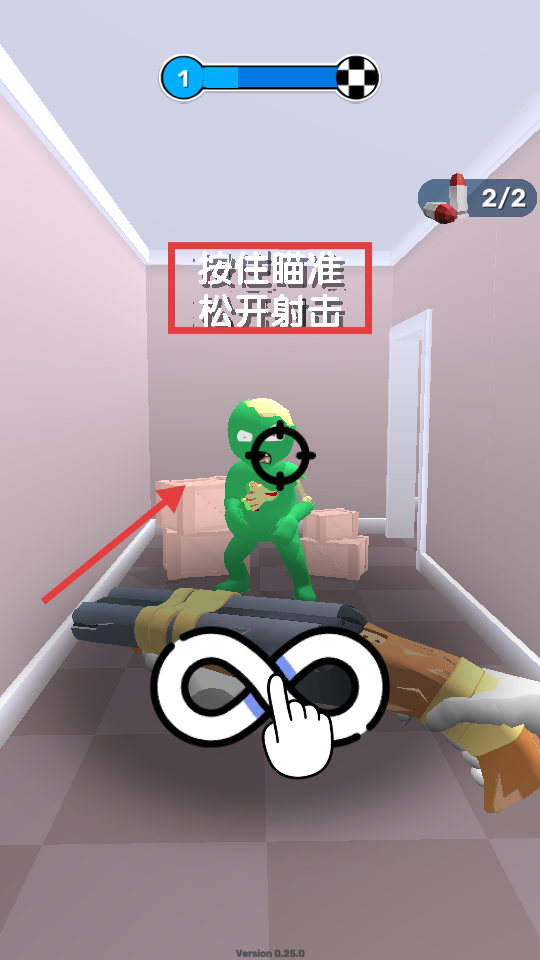 4、关注顶部【1】-进度条与右侧【0/2】-子弹数,合理射击,击败僵尸推进关卡。