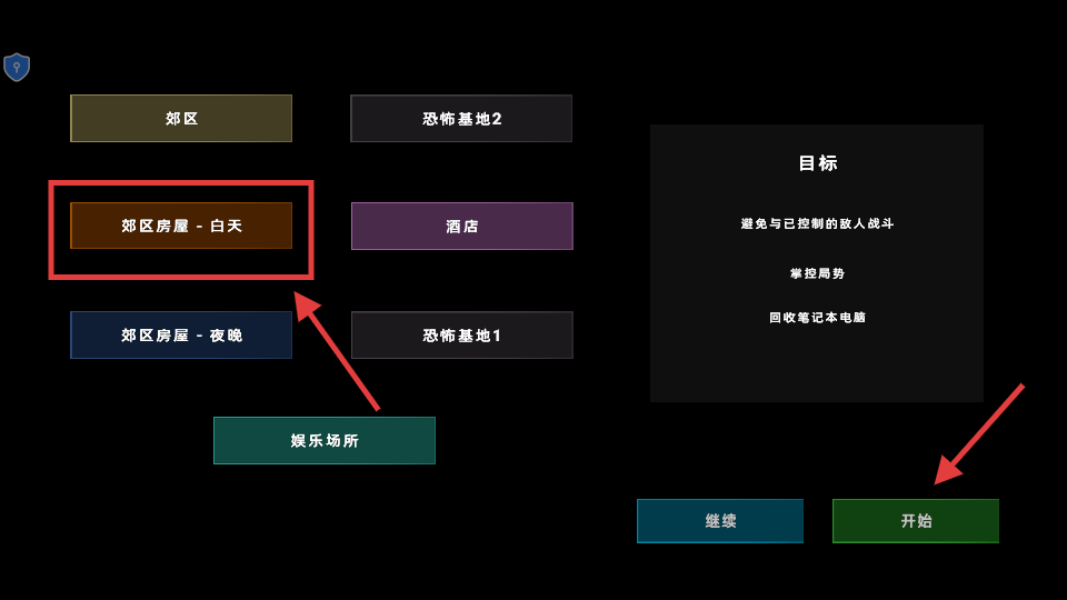 1、选择【郊区房屋-白天】任务场景,确认目标后点击【开始】,进入特警反恐作战环节。