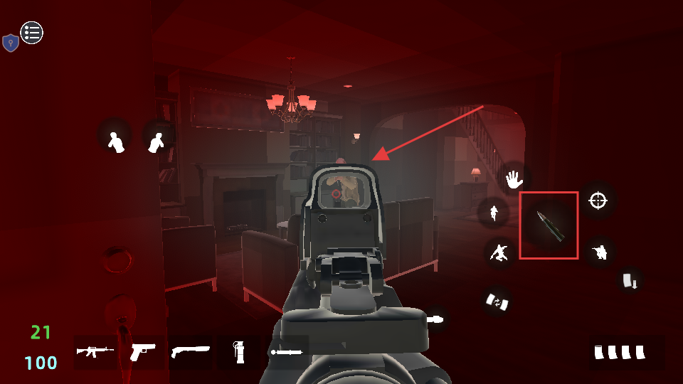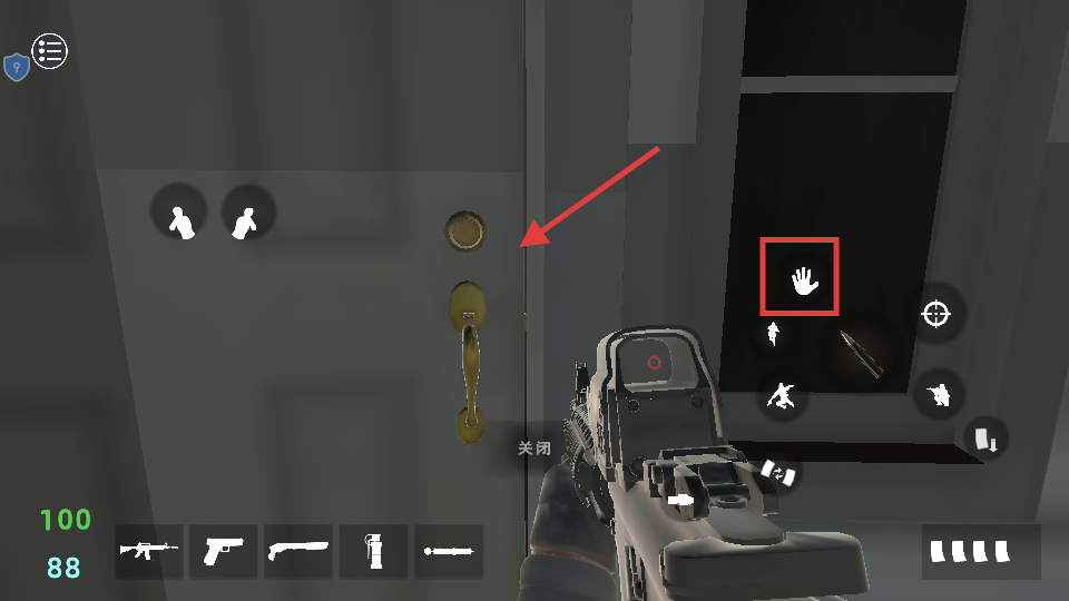 2、靠近门时点击【手】图标互动开门,按需点【关闭】控门状态,灵活切换底部武器应对突发情况。
