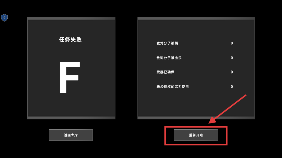 4、任务失败后点击【重新开始】,复盘失误点(如敌对分子处理),重新挑战任务。