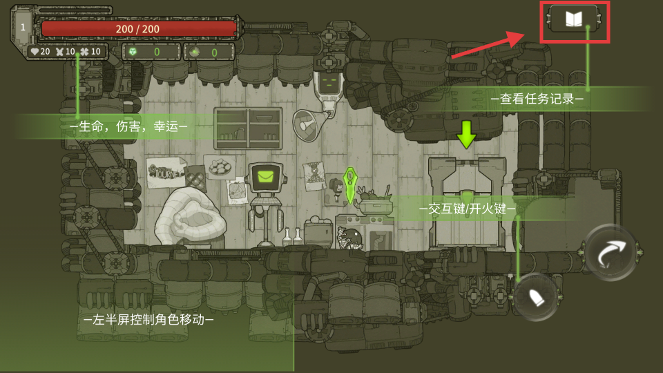 1、左半屏控制角色移动,交互/开火键可交互或射击,点击任务记录按钮查看任务详情。