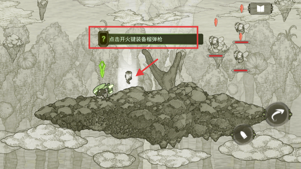 3、按提示点击开火键装备榴弹枪,准备应对右侧飞行的怪物,提升战斗能力。