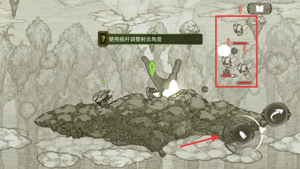4、使用摇杆调整射击角度,瞄准右侧蜜蜂状怪物,按下开火键进行攻击,注意角度精准度。